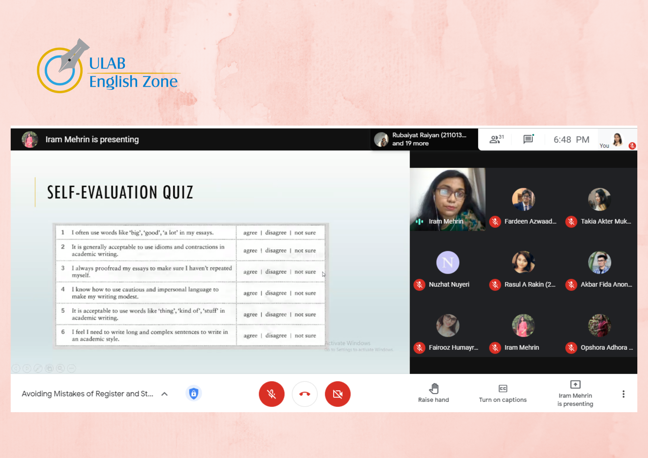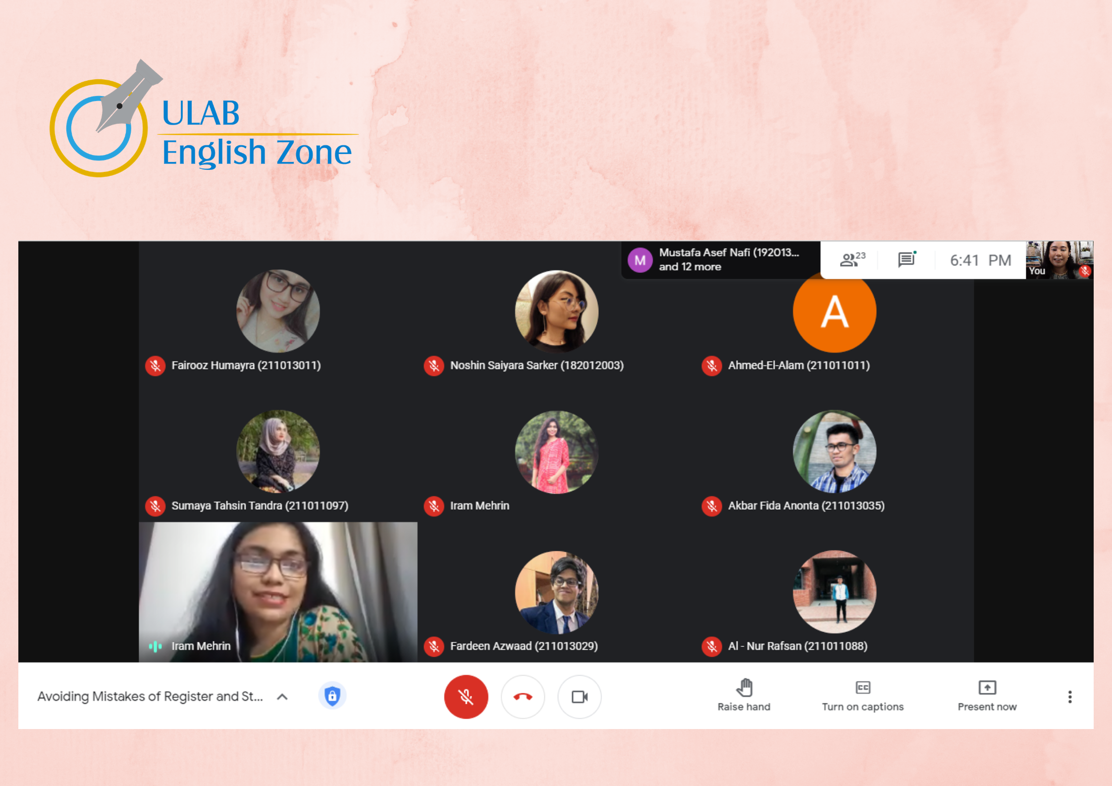 The English Zone of the University of Liberal Arts Bangladesh organized a student workshop titled ‘Register and Style in Academic Writing: Learn to Avoid the Common mistakes’ On 12 April, Monday, 2021. The workshop was facilitated by Iram Mehrin, lecturer, the Center for Language Studies, ULAB. The resource person discussed the four principles of the register of academic writing: formality, efficiency, modesty and clarity with examples of mistakes in these areas. There were practice activities and self-evaluation surveys in the workshop for students. Participants reflected on their present academic language and identified the common mistakes with the help of the evaluation survey. In addition to that, they participated in the practice activities on the four principles of academic writing to avoid making common mistakes. Around the end, there was a small question-answer session where questions regarding specific writing problems from students were addressed by the resource person and appropriate practice approaches were suggested.