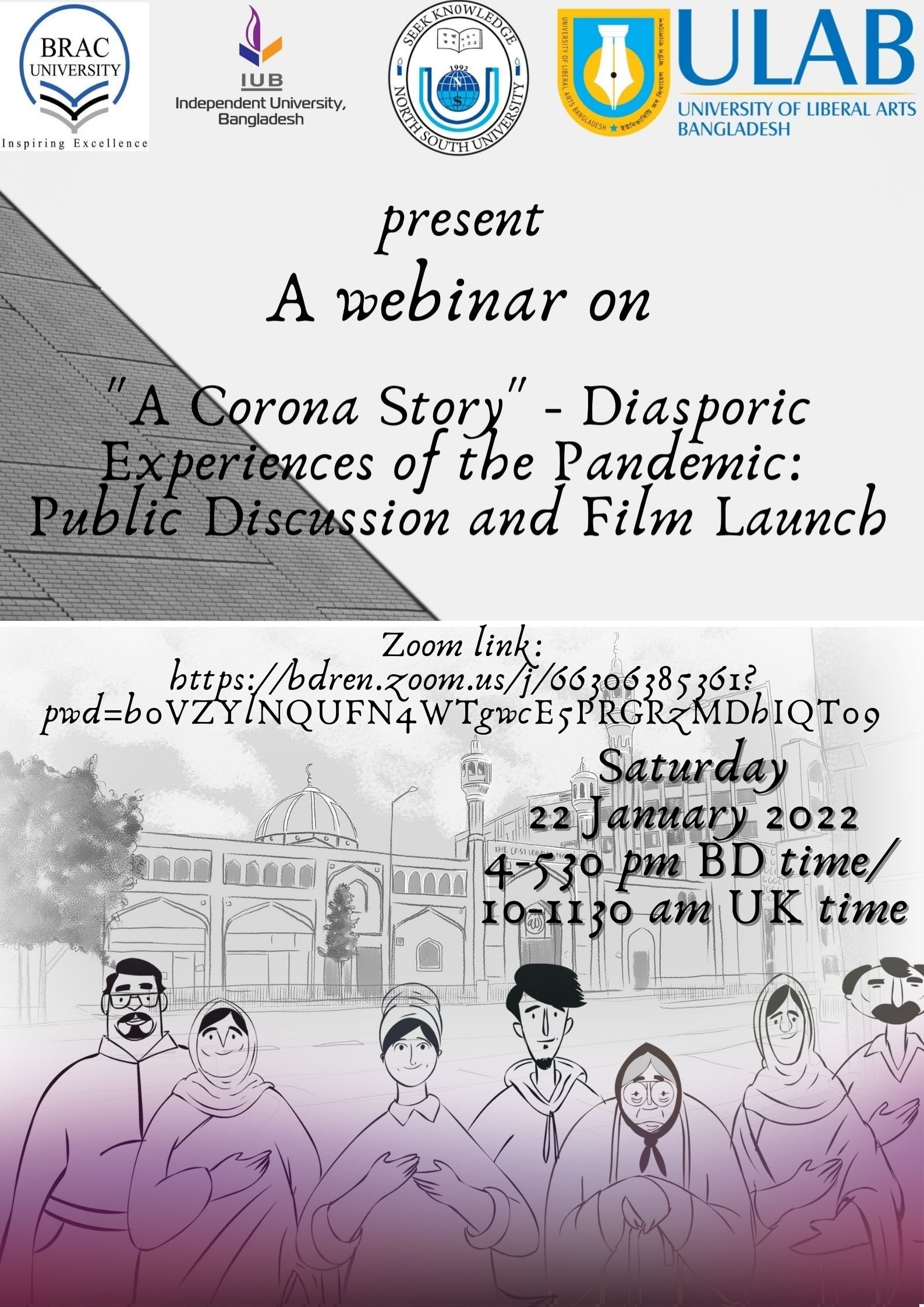The Department of English and Humanities at the University of Liberal Arts Bangladesh (ULAB) organized a webinar titled "A Corona Story": Diasporic Experiences of the Pandemic, by Dr. Chris Tang, Lecturer in International Education & Applied Linguistics, King's College London, in association with the English departments of NSU, BRACU, and IUB, and coordinated by Professor Shaila Sultana. The webinar was held online on January 22, 2022.