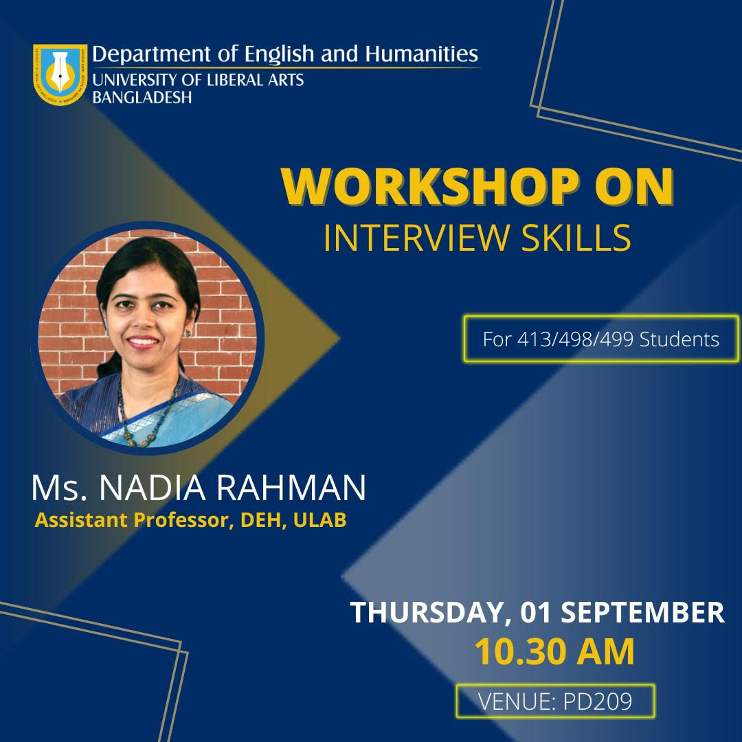 The Department of English and Humanities at the University of Liberal Arts Bangladesh organized a workshop on “Interview Skills” on September 1, 2022. The session was conducted by Ms. Nadia Rahman, Assistant Professor, DEH. The workshop is a part of the series of mandatory workshops tailored for students of ENG413/498/499 of Summer 2022 and aims to provide guidance on the necessary set of skills to ace an interview.