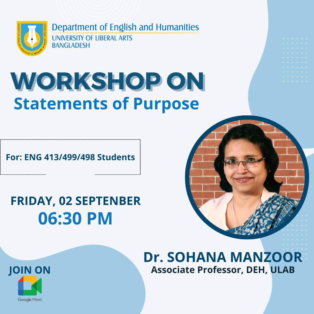 The Department of English and Humanities at the University of Liberal Arts Bangladesh organized a virtual workshop on “Writing Statements of Purpose” on September 2, 2022. The session was conducted by Dr. Sohana Manzoor, Associate Professor, DEH. The workshop aimed to enlighten DEH’s thesis/internship/non-thesis students of the Summer 2022 term about the standard procedures and techniques for writing a flawless Statement of Purpose which is one of the most crucial documents that the students will need while applying for higher studies abroad.
