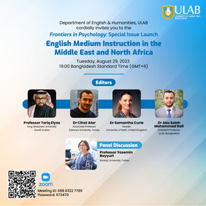 On August 29, 2023, the Department of English and Humanities (DEH), ULAB, organized a virtual launching ceremony for a Special Issue of Frontiers in Psychology, a SCOPUS-indexed journal with an impact factor of 3.8. Titled “English Medium Instruction in the Middle East and North Africa,” this Special Issue addresses the issues and opportunities related to research on English Medium Instruction (EMI). Hosted by Dr. Abu Saleh Mohammad Rafi, Assistant Professor, DEH, ULAB, one of the editors of this Special Issue, the program was joined in by his co-editors Dr. Cihat Atar, Associate Professor, Sakarya University, Turkey; and Dr. Samantha Curle, Reader, University of Bath, UK. The lead editor is Professor Tariq Elyas, King Abdulaziz University, Saudi Arabia. Authors of three of the eight articles in the journal also joined the program. Professor Yasemin Bayyurt, Boaziçi University, Turkey, a specialist in Applied Linguistics, was present as the Panel Discussant.