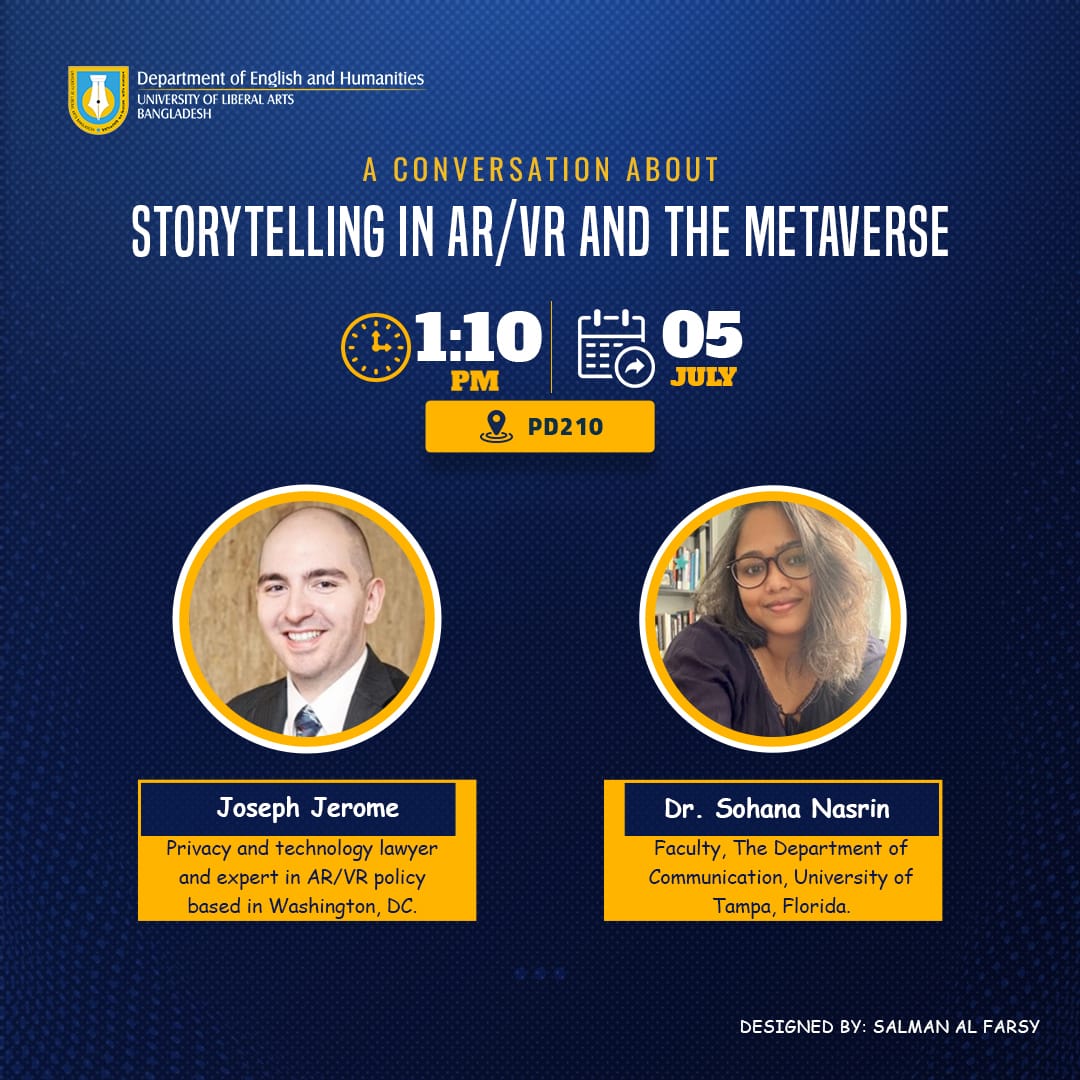 The Department of English and Humanities is delighted to welcome you back from the Eid vacation with a cutting-edge conversation on storytelling in the AR/VR and the metaverse with Dr. Sohana Nasrin, Faculty, The Department of Communication, University of Tampa, Florida; and Joseph Jerome, Privacy and Technology Lawyer and Expert in AR/VR Policy, based in Washington, DC.