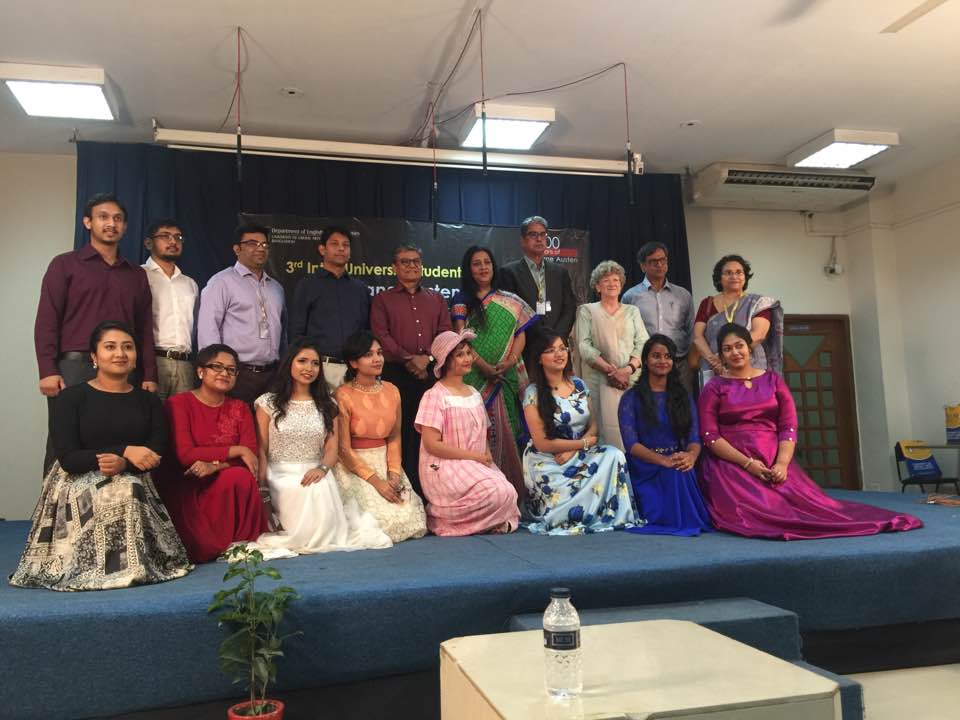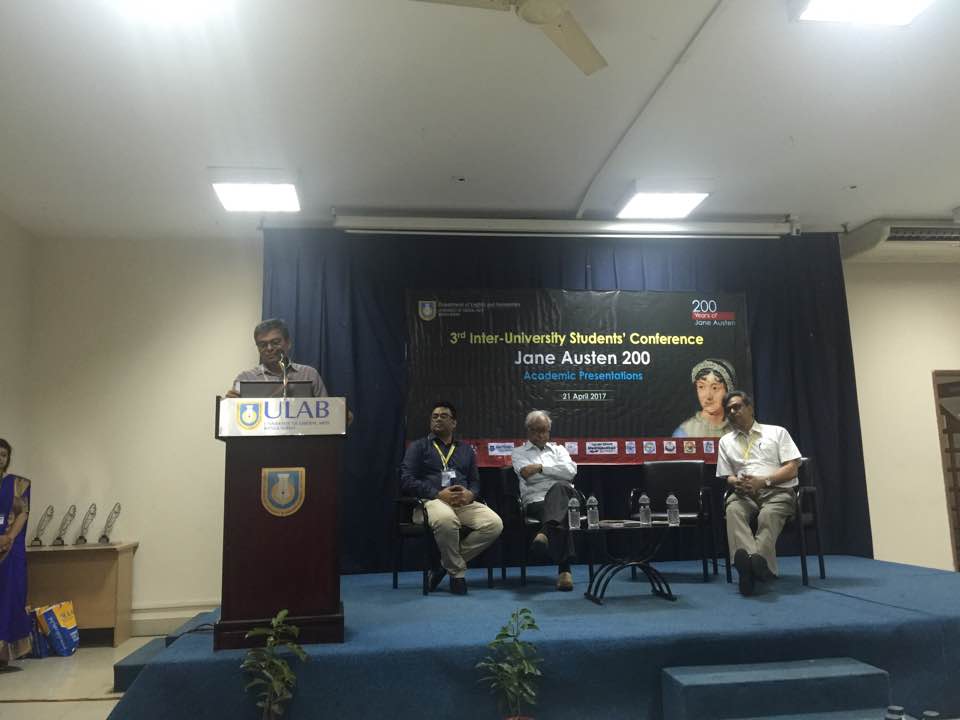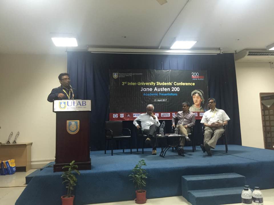 The Department of English at ULAB held its 3rd Inter-University Students’ Conference and Cultural Competition on 21st and 22nd April to commemorate the 200th death anniversary of British novelist Jane Austen. Titled “200 Years of Jane Austen,” the event featured student paper presentation and cultural competition which were performed on 21st and 22nd April successively. Fourteen public and private universities, including BRAC University, Dhaka University, East West University, North South University and ULAB, participated in the academic session. Afia Mursheeda from East West University won the first prize for paper presentation, while S. M. Mahfuzur Rahman of Independent University Bangladesh won the runner up prize. The winner of the cultural program was Dhaka University and the host, University of Liberal Arts Bangladesh (ULAB), won the runner-up prize. Professor Fakrul Alam of Dhaka University, Professor Kamaluddin Ahmed of Chittagong University and Professor Mobasshera Khanam of National University judged the academic papers on the first day. Two best papers selected by the judges received monetary prize and certificates. In the cultural competition, five universities competed with each other for the honor. Renowned actress Ms. Suborna Musthafa and Dhaka University’s Theater and Performance Studies Department’s Professor Sudip Chakroborthy judged the cultural competition held on the second day of the event.