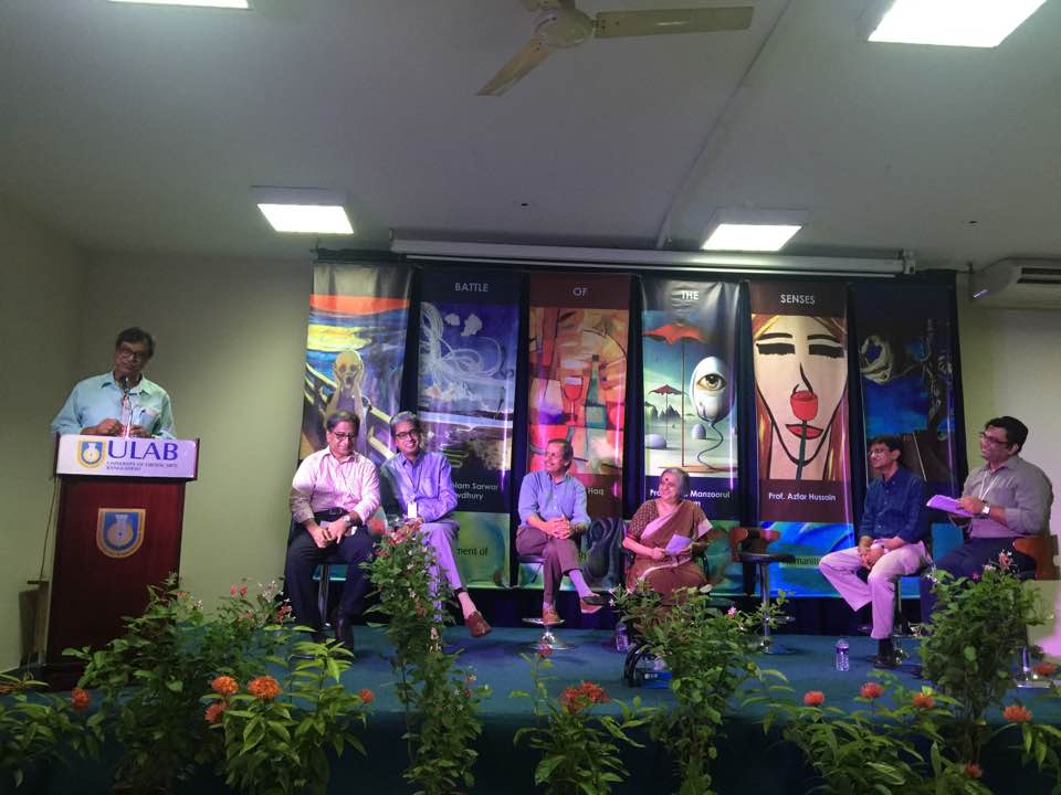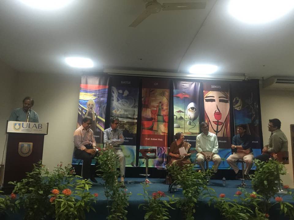 A fun debate featuring some of the most distinguished academics of the country was held at the auditorium of University of Liberal Arts Bangladesh. The debate featured Professors Syed Manzoorul Islam, Kaiser Haq, Fakrul Alam, Azfar Hussain, Golam Sarwar Chowdhury and Shamsad Mortuza who spoke about sight, taste, sound, smell, touch and the sixth sense respectively. Writer, activist and entrepreneur Ms. Khushi Kabir presided over the program as chief guest.
