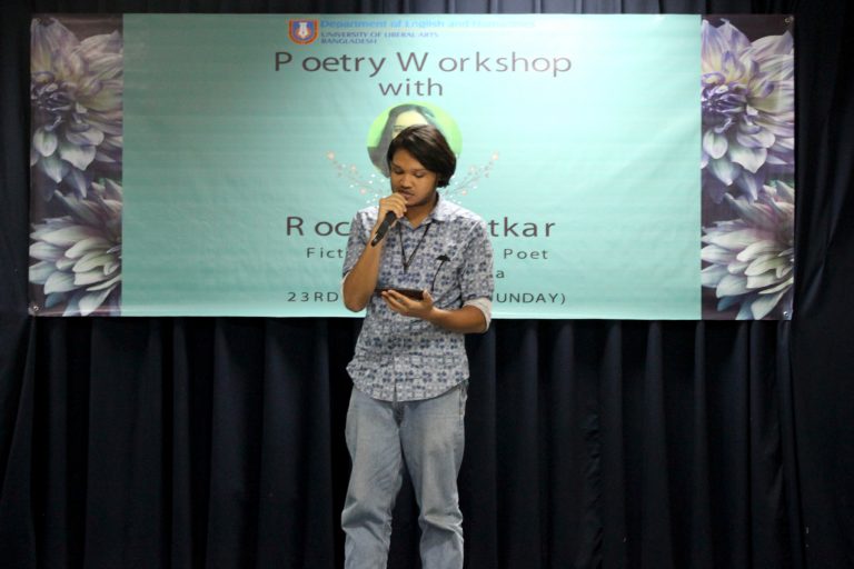 Prof. Fakrul Alam introduced the poet who then began the workshop with a reading of some of her poetry. The workshop focused on the poetic form, haiku, and the haibun.